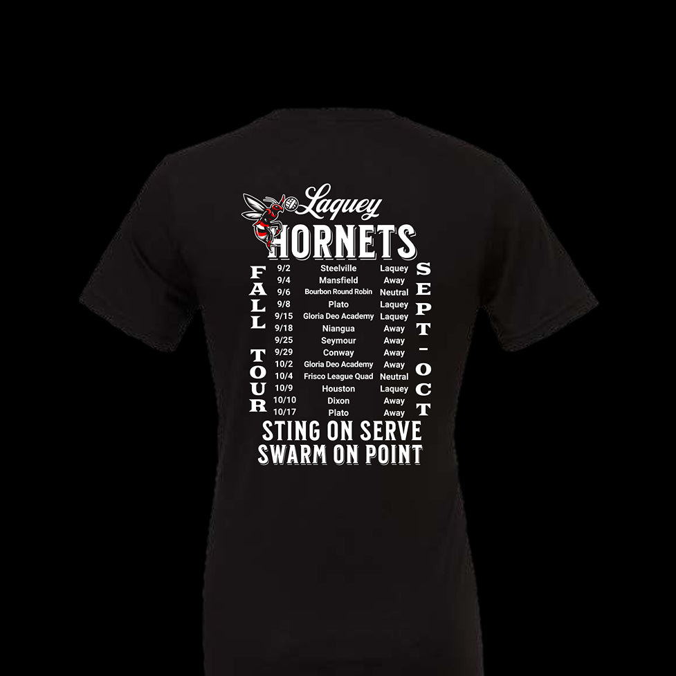 The Laquey Hornets Fall Tour Tee was created to bring team spirit to life with a fresh, band-inspired design. Styled like a classic concert tee, the front highlights the Hornets’ bold identity, while the back features the full game schedule, like a tour lineup. Whether you’re in the stands, around town, or cheering from home, this shirt is the perfect way to rep the Hornets all season long.